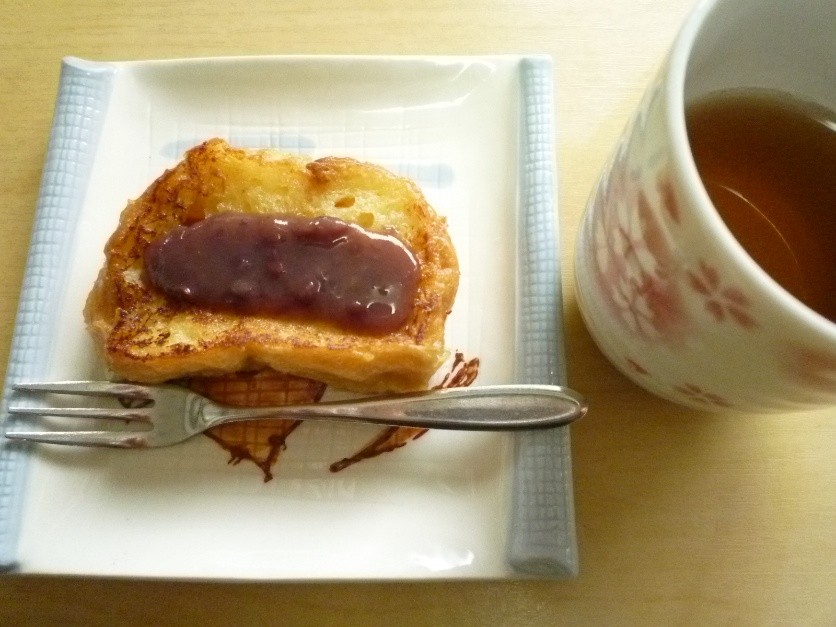 今回の表紙はおやつ。 名付けて「日仏友好アツヒヤ美味フレンチトースト」 材料はバゲット、卵、牛乳、砂糖、バター、数日前におやつで出したぜんざいの残り。